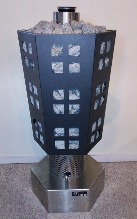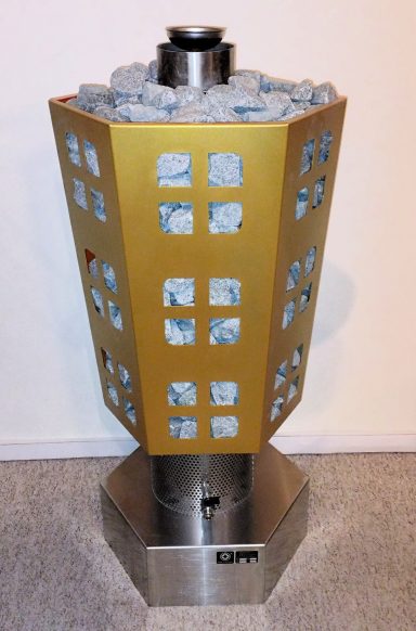 "Royal"-Premium- Baureihe. Die "golden" beschichtete Außenverkleidung besticht in seinem seinem edlen - markanten "Tower-Design" mit dem offen gestalteten Design-Korb,mit optimaler Luftkonvektion durch die ideale "K-Form". Ein High-Performance-Heizgerät komplett aus Edelstahl mit "royaler" spezial Beschichtung des 6 Eck Design-Außenmantels. Serienmäßig mit dem "Master-Löyly" ausgestattet.Wie alle Premium-Klasse Heizgeräte ,sind diese zur Aufstellung vor Glasflächen oder auch in der Mitte einer Kabine geeignet. Eine Reling sorgt für Sicherheit.Diese kann auch mit einer "LED" Color-Band ausgestattet werden.(Chromotherapie) Für eine besondere Ausführung kann auch mit einer "Beflockung", als Berührungsschutz, angewendet werden.